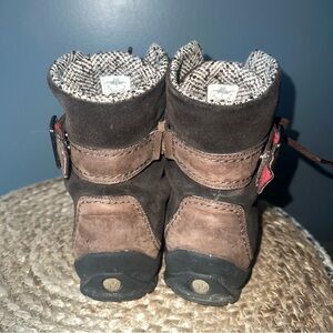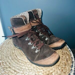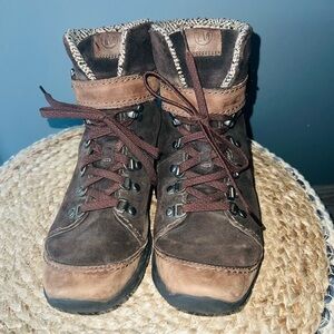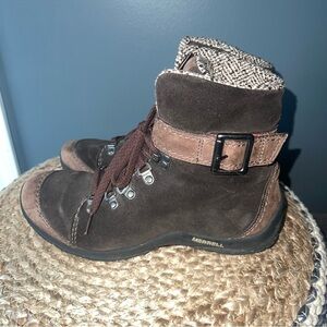 Merrell Brown Suede Waterproof Lace Up Buckled Strap Hiking Boot. Rugged Rubber Grip Sole. GUC🚭