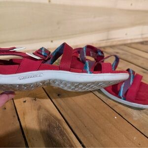 Vibrant red Merrell sandals featuring blue straps. Ideal for summer adventures. Great condition
