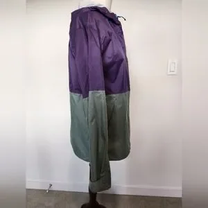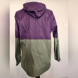Perfect condition, likely never worn. Wind and rain jacket. Olive and purple with turquoise zippers.