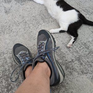Lightweight and very comfortable, I bought another pair with blue accents that are my go-to walking around shoes. I thought I would use both but have never worn this pair. They are mesh and synthetic with lace closure. They have a 4.5 mm lug depth and weigh just a little over 1 lb. I'm not really sure what Poshmark means by "with tags" but full disclosure, you won't get actual tags with these shoes, just the metaphorical ones. I will ship in the original box with all original packing material.