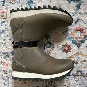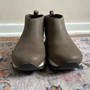 EUC pair of tannish/brown slip on shoes from Merrell. Size 7. These shoes/boots are like a Chelsea style slip on style. Slight lift in the heel. Some stretching of the elastic around the ankle as pictured. No stains or flaws!