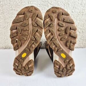 The neutral tan, brown, and black colorway makes them versatile for outdoor use or casual styling. This pair (model J004533, men’s US 12) shows light wear on the soles but remains in great pre-owned condition with plenty of tread life left.