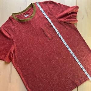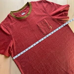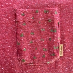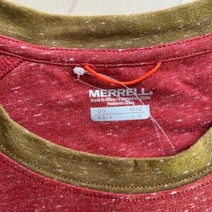 Heathered red short sleeve t-shirt with breast pocket featuring brown pine tree screen-printed pattern, leather Merrell tag, and coordinating brown crewneck collar by Merrell. Made with their "DRY" moisture wicking material. Men's size medium, please see photos for approximate measurements. New with tags.
