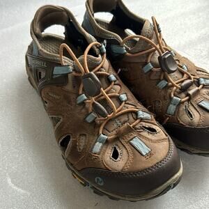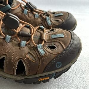 Merrell Vibram Water Shoes 8.5 Women’s Brown Blue Slip On Sandals Hike Camp