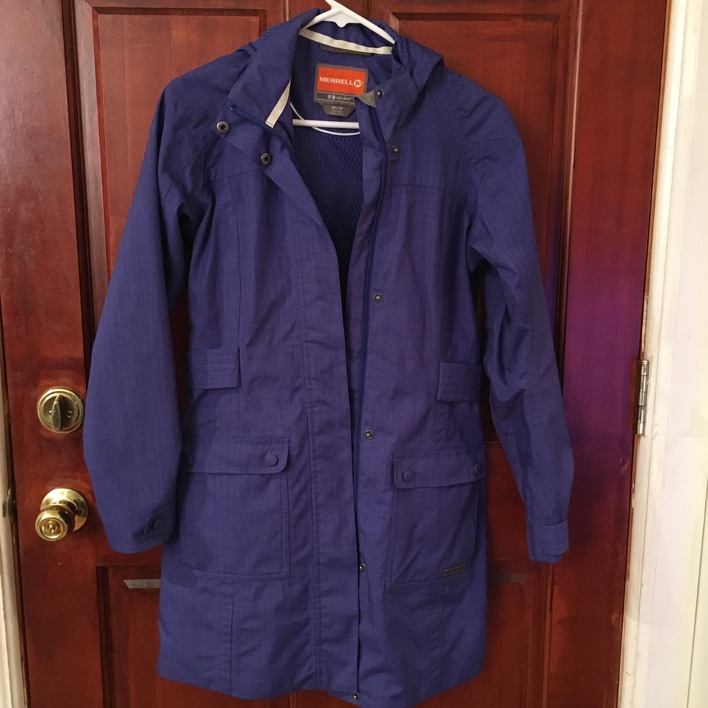 Beautiful blue Opti-Shell raincoat from Merrell. Extremely waterproof! Button and zipper closure. Tons of pockets including a hidden inner zipper pocket. Hood is detachable. Concealed drawstring waist for tailored fit.
