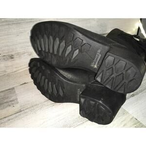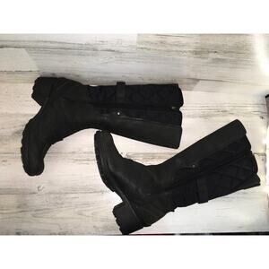 This is a pair of Merrell Performance Footwear Winter Riding Boots in color Black. Quilted pattern on rear and leather on front. Womens Size 7.5. 1.75" Heel. 0.5" Platform. 13" shaft. Waterproof. Slip Resistant. Inside full zipper. Insulated. Condition as seen in pictures. Wear to toes as seen in last picture.