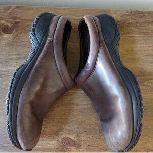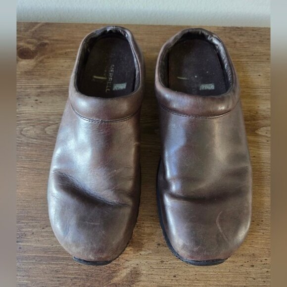 Preowned Merrell Womens Dark Brown Sleek and comfortable loafers. Ideal for casual wear. Durable leather construction. it has some scratches as You can see at picture