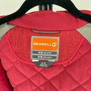 Merrell Women's Opti Shell Parka in red, size medium. Hood is attached, insulated jacket, zippered pockets with weather proof zippers, toggle inside to synch to keep elements out, arm pit vents with zippers. No stains or damage, in excellent used condition. Please see photos with measurements to ensure fit.