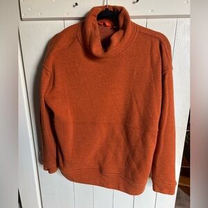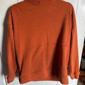 This Merrell Women's Pullover Sweatshirt in size Medium is designed for active women. The sweatshirt features a front pocket for convenience and is made of cozy fleece fabric, providing warmth and comfort during workouts or outdoor activities. The orange color adds a vibrant touch to the pullover, while the pullover style makes it easy to throw on for casual wear. Perfect for those looking for a stylish and functional activewear piece. Some pilling as pictured.
