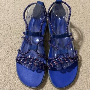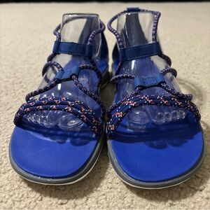 Close look at the last picture that show some slight peeling on the inside heel of the right shoe. This purely cosmetic though. The rest of shoe is immaculate The Merrell Women's Size 11 Bungee Sunstone Slip-On Sandals are comfortable and stylish sandals perfect for casual wear. The slip-on design makes them easy to put on and take off, while the lightweight and cushioned construction provides all-day comfort. The strappy design adds a touch of sporty flair, making them great for outdoor activities or casual outings. The solid blue color with the Merrell logo accents gives them a trendy and recognizable look, while the adjustable strap ensures a perfect fit for your feet. Ideal for summer, fall, or spring, these sandals are a versatile addition to any wardrobe.