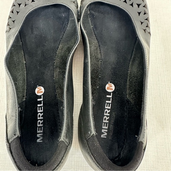 Merrell Women's Size 7.5 Mimix Haze Black Leather Cut Out Slip On Ballet Flats in good preowned condition. Normal wear to body and some wear to footbed.