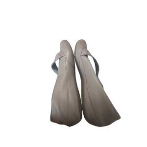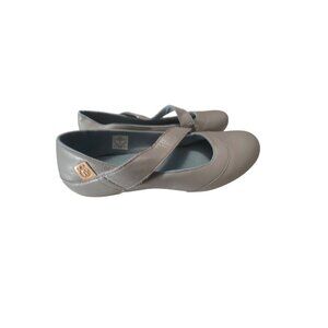 These Merrell Mary Jane shoes offer a blend of style and comfort. Made from durable leather, they feature a secure strap for a snug fit. The shoes' sleek gray color adds a touch of elegance to any outfit, while the sturdy construction ensures long-lasting wear.