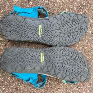 These super cute TEAL Merrell walking sandals are in near perfect condition. I wore them one time. They just don’t jive with my personal style - despite being my favorite color! Comfy leather, “fresh step” tech, velcro closure for the perfect fit and a toe loop.