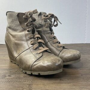 Merrell Womens Wedgetarian Lexi Taupe Grey Leather Hiking Style Boots, size 10.5. In good used condition but have been loved. See pictures for wear and condition.