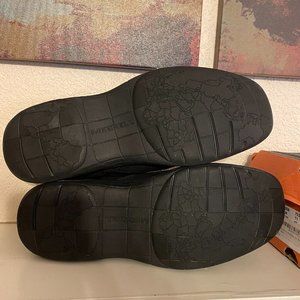 Awesome pair of Merrell World Vue Lace sneakers, new in box, black suede. (New in box, but box may be damaged.) 100% leather and fabric upper, synthetic sole. Kinetic Fit removable contoured footbed for support. Nylon arch shank. EVA midsole for comfort. Great pair of shoes for everyday wear, casual or work shoes!