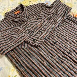 Good condition size XL, colors are dark gray light stripes of blue and dark orange