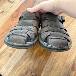 Men’s leather sandals from Merrell, style name is World Midway Bracken.