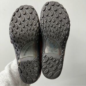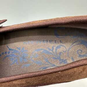 Merrell plaza bandeau cherry oak brown suede leather mary jane shoes women's 9. left foot button cover missing.