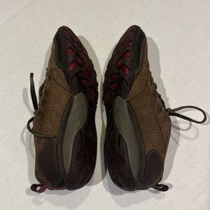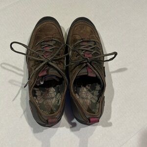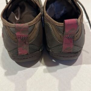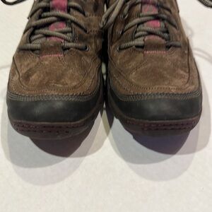 Merrell stone performance lace up hiking shoes in a suede brown with magenta