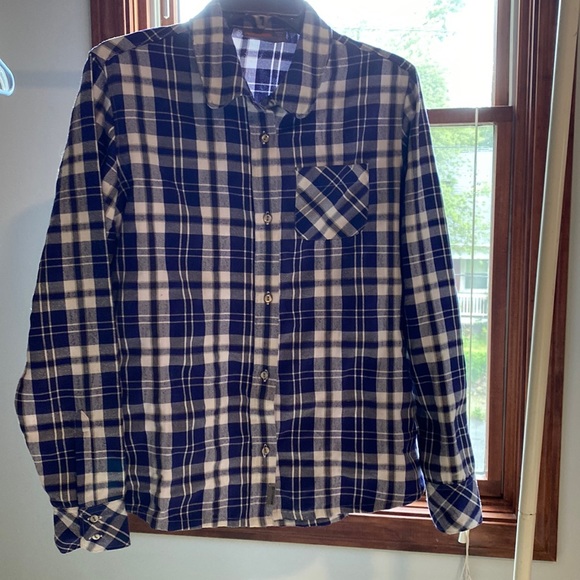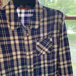 Merrell 100% nylon flannel shirt, blue and black plaid, button down front with chest snap, size large