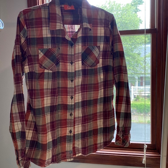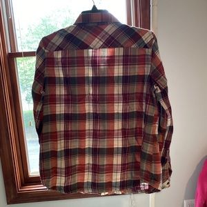 Merrell 100% cotton flannel shirt, button down front with two front pockets, size large, tan and rust plaid