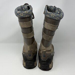 Merrell women's Boulder Waterproof Boots, size 11. Tall boot, hits below knee. Inside zip for easy on/off. Cute snowflake pattern at top of calf. Neutral tan/grey tones except for blue and cream snowflake design at top. Gently worn, in very good used condition. Minor wear throughout, especially at toes and backs of heels/ankles. Size tag quite worn. See photos.