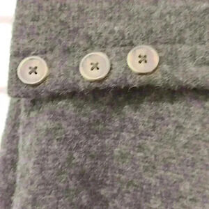 feels like wool even though the tag does not say it buttons on the lapel on top near the neckline