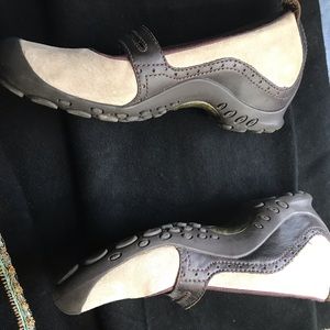 Nicely per sueded Mary Jane style shoes with anti slip, light hiking foot soles. Taupe/khakis with dark brown leather.