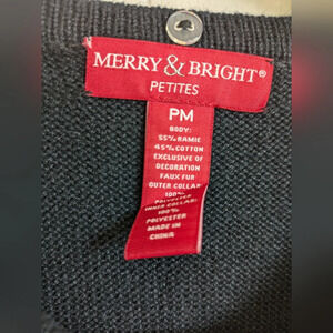 Merry & Bright Petites Snowflake Vest in Black, size Petite Medium, is ideal for the holiday season. With approximate dimensions of 20" in length and 23" in width, this vest features charming white shimmer accents on the snowflakes, making it a delightful choice for winter festivities, Christmas celebrations, and snowy outings. Crafted from a comfortable cotton blend, it’s perfect for staying stylish and warm during the colder months. Great condition.
