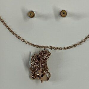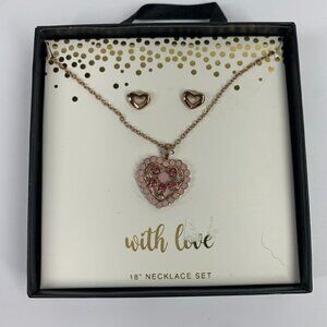Festive necklace and earring set featuring a pink rhinestone studded heart pendant on fine link gold tone 18" chain and coordinating rose gold openwork metal heart shaped stud earrings with post backs. New in original presentation box.