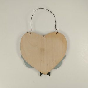 A "Merry Christmas" cats wooden heart country rustic holiday ornament. It is about 4.5 inches long (6.5 inches long with the metal handle) and 4.5 inches wide. New with shelf wear.