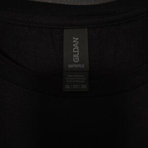 New without tags black Christmas t-shirt featuring "Merry Christmas" text with plaid lettering and Santa hat detail. Made by Gildan in their popular SoftStyle cotton blend for comfort and durability. Size 2XL with relaxed fit. Perfect for holiday celebrations or casual winter wear.