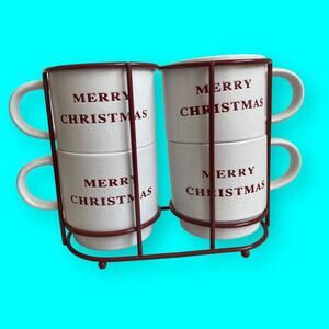 MERRY CHRISTMAS Stacking Mugs in Red Metal Rack. Marked Holly and Joy By Market Finds. These are Porcelain 16 oz Coffee Mugs. They are dishwasher and microwave safe.