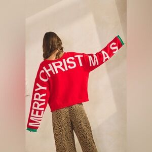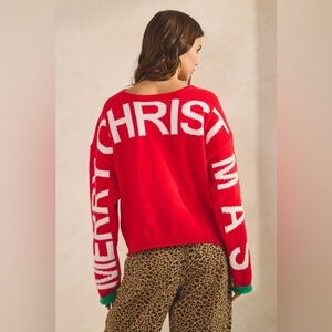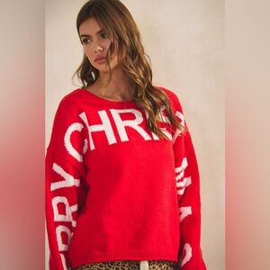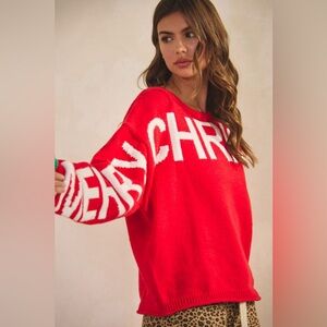 Say it like you mean it with this fun and festive red sweater with white Merry Christmas lettering. This sweater is the perfect top to wear for any of your holiday parties. This red sweater has white Merry Christmas lettering across the chest and arms. It is a great top to add to your holiday rotation that is very festive as well as warm and cozy. The sweater has an oversized fit you can definitely layer it. The sweater is designed for you to be able to wear the Merry Christmas on the front or the back. You can pair it with any of your favorite bottoms.