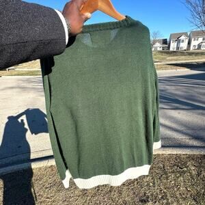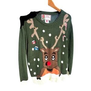 Preowned Rudolph Christmas sweater in good condition. In the size large. Pictures taken outside to show true color.