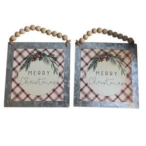 2-Merry Christmas Ornament - Farmhouse Sign Wooden Bead Hanger Galvanized Metal