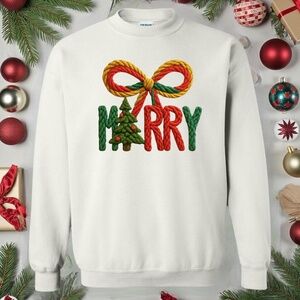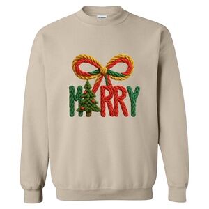 Get tied up in the holiday spirit! This vibrant Sweatshirt spells out "MERRY" in a wonderfully detailed, twisted rope texture. Featuring a decorated Christmas tree in place of the "E" and topped with a festive bow