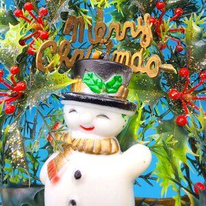 Merry Christmas Tree Snowman Flocked Poinsettia 1970s Kitsch Plastic Hong Kong