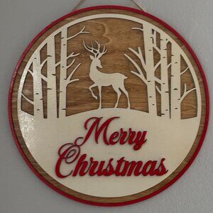 Bring timeless Christmas charm to your home with this handmade “Merry Christmas” wooden sign, crafted from 1/8” premium basswood. Featuring a layered laser-cut deer in a forest scene with red script lettering and a natural wood finish, this piece adds cozy, rustic elegance to your holiday décor.