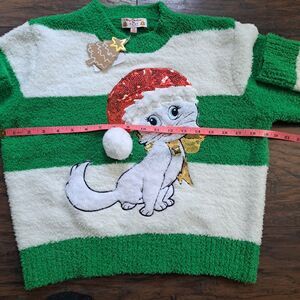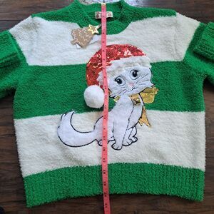 Merry Christmas by Poof Sweater Med Green White Sparkle Kitty Hat Bell NWT