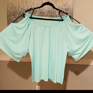 Merry Fun 2XL Soft Teal Cold Shoulder Sleeve top . gently used. Top is 2XL but is slightly larger than 2XL and very stretchy material