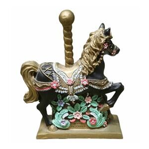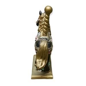 Golden Horse Carousel Clock Figurine Beautiful Piece with pastel colors with flowers and vines around the clock and saddle. The figurine is in great condition however the clock isn't working.