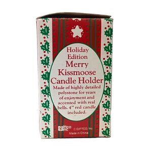 Merry Kiss Moose Candle Holder Vintage Xmas Miniature Holiday Edition Ornament. Condition is pre-owned and vintage 1990s. No chips or cracks. Candle not completely straight. Measures about 4" tall. Please see all photos for detailed condition.
