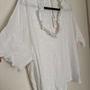 The Amelia Cuff Tee is a versatile short-sleeve V-neck with darling ruffle shoulder details to add spice to every look. Perfect for afternoons in your favorite pair of jeans or casual afternoons in the neighborhood.