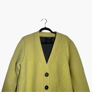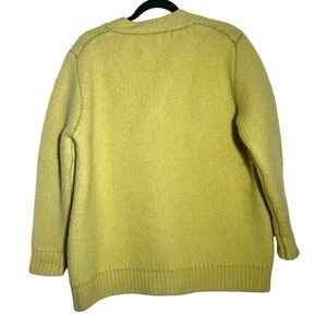 Yellow, weighted, double face cardigan. 100% wool exterior and fully lined with 100% cashmere. Size small but has an oversized fit. Preowned with a hole on the sleeve. The hole Is only on the yellow wool side. Cashmere side is still intact. Minimal pilling. Otherwise in good shape.