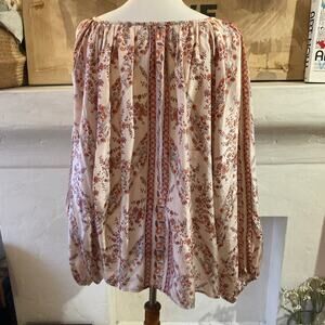 100% silk, gypsy boho chic blouse, ecru red & orange, crew neck, balloon sleeves, button front.
