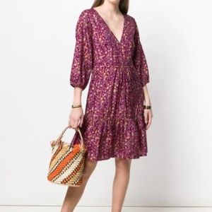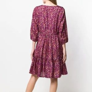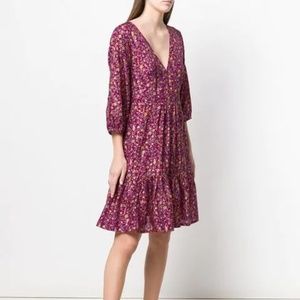 Purple silk Craquante dress from Mes Demoiselles featuring a v-neck, three-quarter length sleeves, a front button fastening and a flared style.