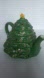 Charming teapot shaped like a Christmas tree. Features vibrant green with colorful decorations.