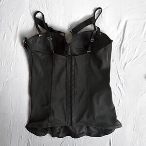 Mesh black buckle body-hugging corset made out of poly/spandex will make you feel like a queen! This sultry black corset features adjustable shoulder straps, back hook and eye closures, and flattering cups.