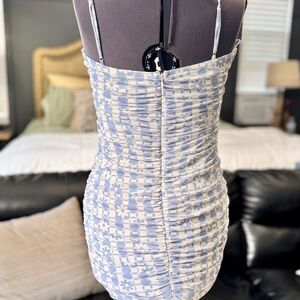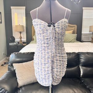 Bring the retro charm with a modern twist in this Cotton Candy LA ruched mini dress. Features a blue-and-white daisy print, fully ruched silhouette, and adjustable center front drawstring. Made from soft, stretchy mesh over a full lining, this dress hugs all the right curves while keeping things comfortable.
